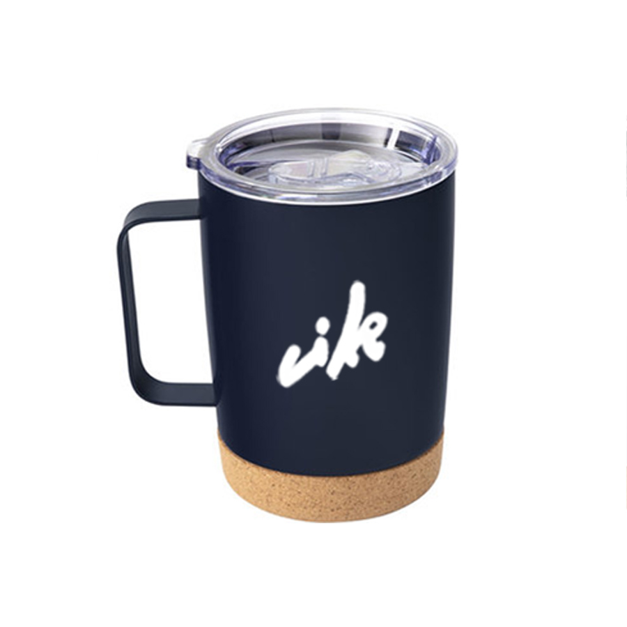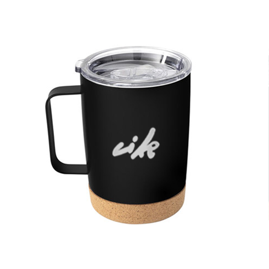 Mug doble pared con asa, sellado al vacío. Mug con aislamiento térmico. Tecnología vacuum. Interior en acero 304 y exterior en acero 201. Tapa de poliestireno con anillo de silicona. Asa metálica. Base de corcho. Pintura acabado semi mate. Mantiene hasta 12 hs la temperatura de las bebidas calientes y 24 hs de las bebidas frías.