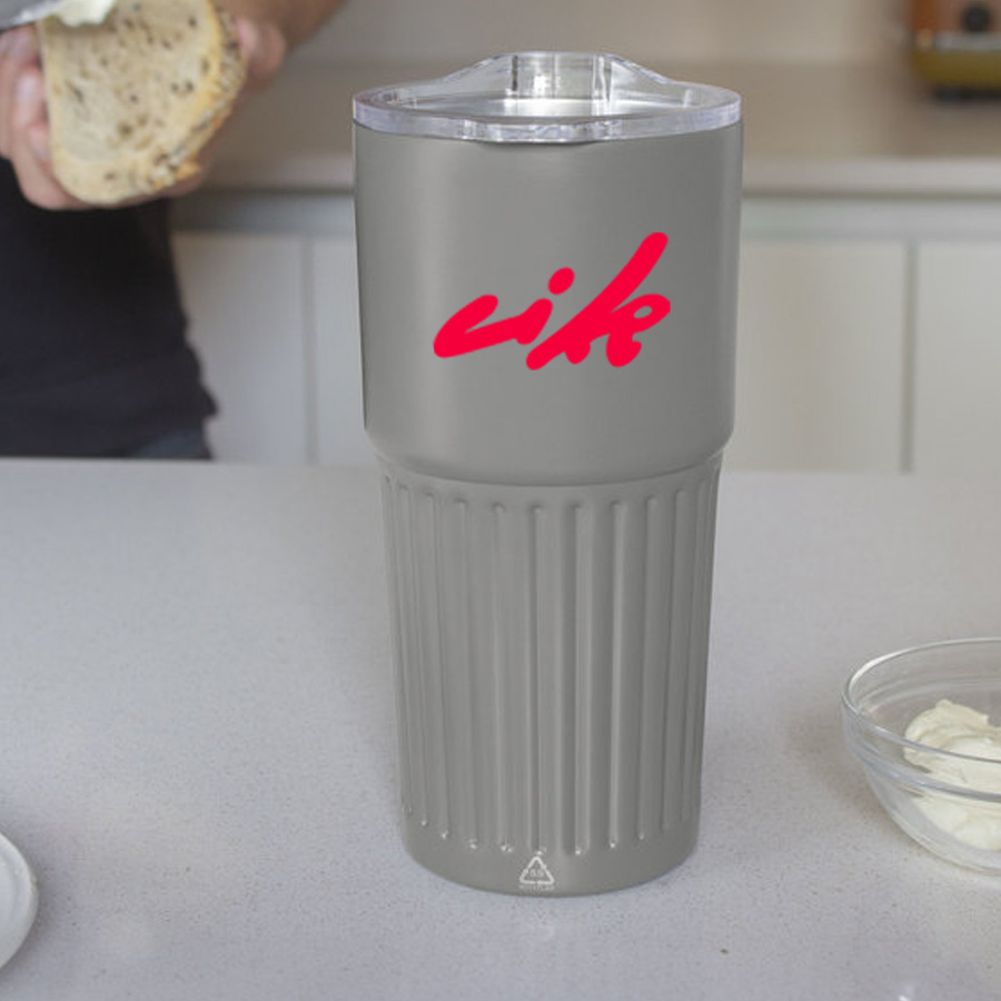 Mug doble pared, sellado al vacío. Mug con aislamiento térmico. Tecnología vacuum. Interior en acero 304 reciclado y exterior en acero 201. Tapa de poliestireno con anillo de silicona. Pintura acabado semi mate. Parte inferior texturada para un mejor agarre. Base antideslizante. Mantiene hasta 12 hs la temperatura de las bebidas calientes y 24 hs de las bebidas frías.