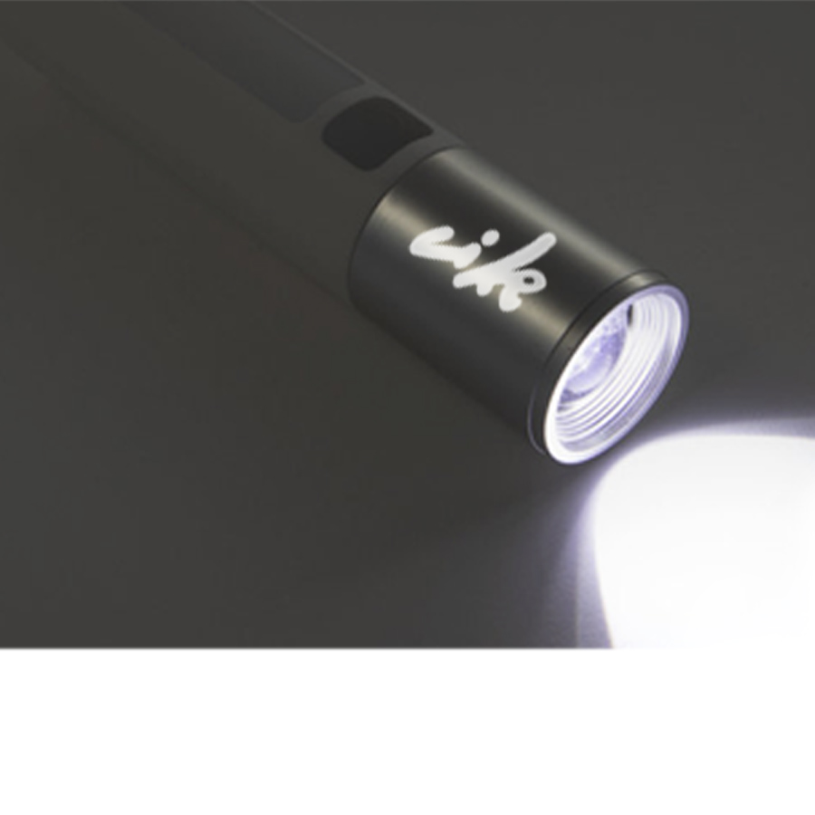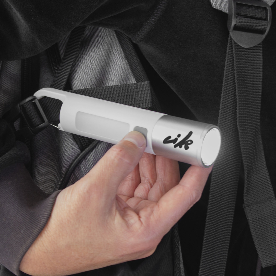 Linterna portátil recargable. Con mosquetón incorporado. Luz de emergencia y 2 intensidades de iluminación (alta e intermitente). Batería recargable 800 mAh. Fuente de luz 7 leds de alta potencia. Puerto USB-C oculto (se desplaza el cuerpo hacia arriba). Cable de carga color blanco.
