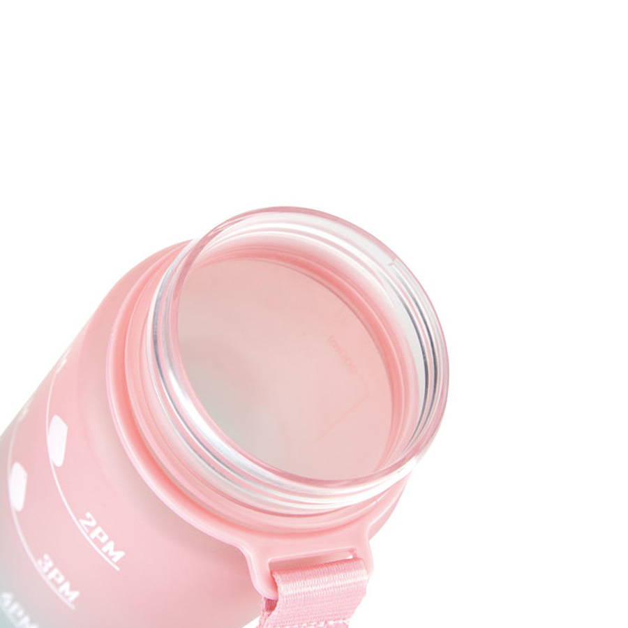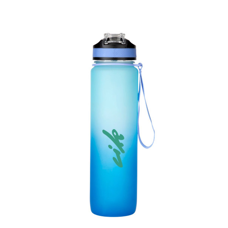 Botella con marcador de tiempo y medida. Colores pastel bitono en degradé con acabado frost. Tapa plástica combinada en color negro con un color de la botella. Apertura rápida, boquilla transparente rebatible y sorbete incluído. Correa del mismo color de la botella.